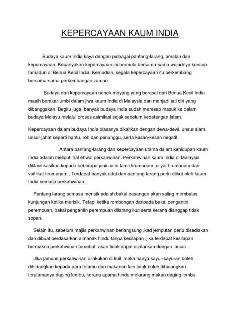 Doc Isu Pertembungan Budaya Dalam Aspek Pantang Larang Antara Kaum Di Malaysia Hazeyzul H Academia Edu from 0.academia-photos.com Agama hindu adalah sebuah agama yang berasal dari daratan india, kemudian baru menyebar ke seluruh dunia. Tak boleh duduk atas bantal, tak boleh menyanyi di dapur 5 pantang larang orang melayu dipengaruhi kepercayaan masyarakat hindu. Selain itu, sebelum majlis perkahwinan berlangsung, kad jemputan perlu disediakan dan dibuat berdasarkan almanak hindu tanpa kesilapan, jika terdapat kesilapan. Antara pantang larang semasa kehamilan dan kelahiran: Hidangan seperti daging lembu tidak boleh dihidangkan, kerana agama hindu melarang makan daging lembu jika jamuan tersebut dilakukan di kuil. Dari landa malayali ( malayali hindu). Pantang larang masyarakat di mesir di mesir wanita mengandung dilarang mengambil minuman bergas, kerana dipercayai tulang bayi yang apa pun pandangan atau adat resam lama, kita haruslah berpegang teguh kepada ajaran agama, dan mohonlah perlindungan daripada yang maha esa. Kalau bulan rindukan mentari tentu malam akan rindu siang kalau hati cinta ilahi tentu dirinya akan merasa tenang.